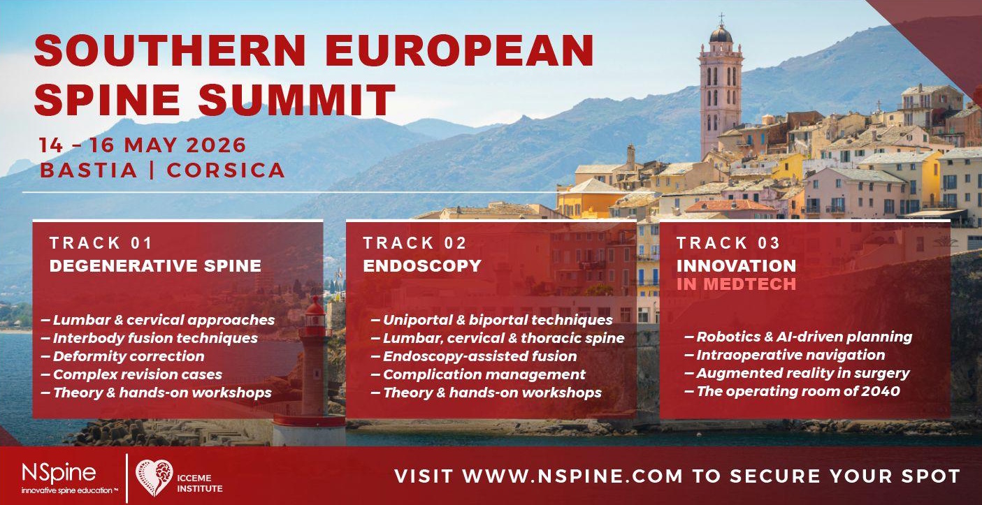 Join a 2.5-day intensive spine surgery summit in Bastia, Corsica, featuring hands-on training, live workshops, and three parallel tracks covering degenerative spine, endoscopy, and medtech innovation.